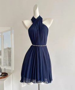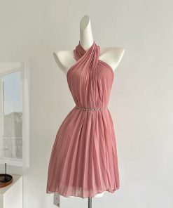 ម៉ូត (Style): ជារ៉ូបខ្លីបែប Halter Neck (រ៉ូបបង់ក) ដែលមានការរចនាបែបបត់ខ្វែងគ្នានៅផ្នែកខាងមុខ (Criss-cross wrap) បង្កើតបានជាផ្នត់ៗយ៉ាងមានសម្រស់។